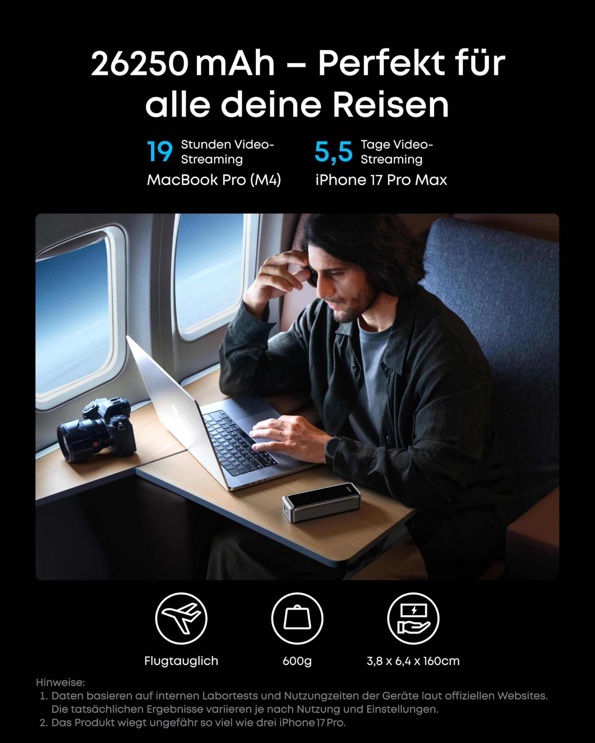- Große Kapazität, TSA-konform: 26.250 mAh (99,75 Wh) liefern genug Energie für Laptop und mehrere Smartphones und sind gleichzeitig für Flugreisen (Handgepäck, TSA-konform) geeignet.