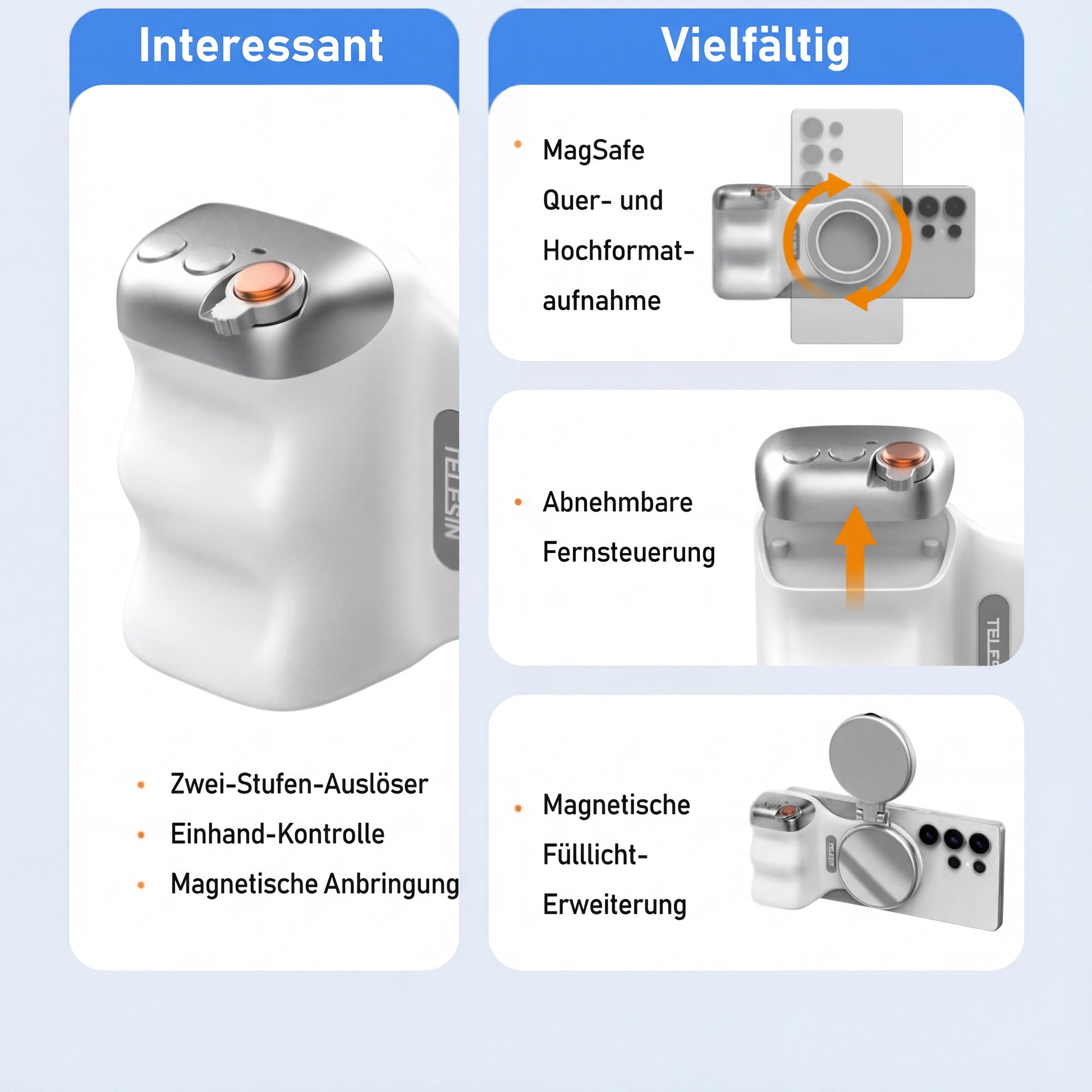 Der ELEXUM Magnetische Smartphone Kameragriff revolutioniert deine mobile Fotografie. Mit 8-fach starker Magnetkraft, ergonomischem Design und integrierter Bluetooth-Fernbedienung hältst du dein Smartphone sicher und steuerst Kamera, Zoom und Auslöser mit einer Hand. Das doppelseitige Fülllicht mit 3 Farbtemperaturen sorgt für perfekte Beleuchtung bei Selfies und Vlogs – ideal für Content Creator, Reisende und Selfie-Liebhaber.